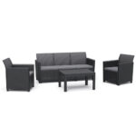 A grafit színű rattan kerti bútor szett két darab 65x 63 x 74 cm-es fotelből, egy 65x 163x 74 cm-es három személyes kanapéból és egy 78x 58,5x 43 cm-es orlando asztalból áll. Ez egy kiváló minőségű termék, amely a legjobb minőségű fröccsöntött műanyagból készült.