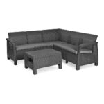 Corfu Relax grafit szett A Corfu Relax grafitkészlet egy rendkívül funkcionális sarok (méretei 182x182x79) és egy dohányzóasztal, amely a Corfu sorozat többi készletéből ismert. A nagy terasz sarok egy bútordarab, amelyet a sorozat rajongói várnak. Az erős ülés a háztartás tagjait és a vendégeket befogadja , a puha üléspárnák és a kontúros háttámlák biztosítják a megfelelő kényelmet. Az asztal és a sarok a technorattánt imitáló mintával vannak borítva, de rendkívül ellenálló műanyagból készülnek.