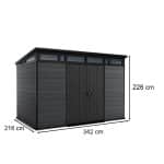 A termék méretei – 342 cm szélesség, 216 cm mélység és 226 cm magasság – ideálisak a különféle kerti szerszámok, gépek és kiegészítők tárolásához. A könnyen tisztítható felület és a praktikus belső kialakítás még tovább növeli a használati kényelmet.