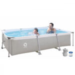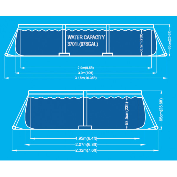 A téglalap alakú medence méretei: 300 cm hosszú, 207 cm széles és 65 cm magas. A többrétegű PVC-ből készült szintetikus bevonattal, a szerkezet pedig rozsdamentes acélcsövekből készült. 2006 l/h teljesítményű szűrőszivattyúval szállítjuk, szűrőpatronnal.