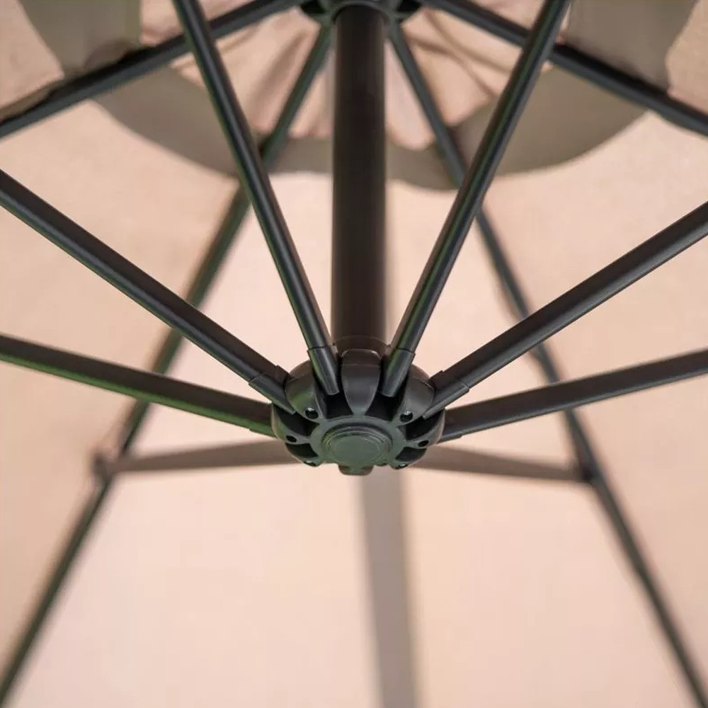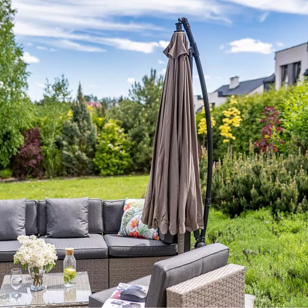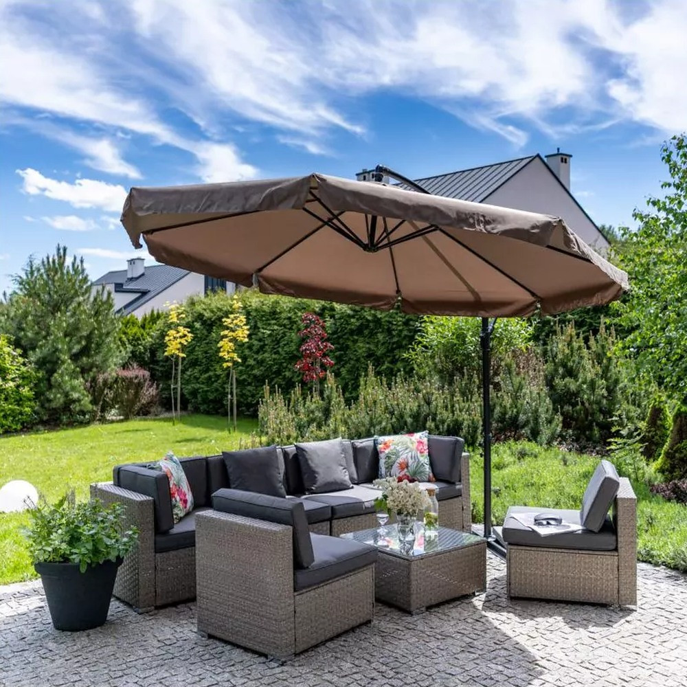 a kert dísze is. Az ernyő könnyen használható és ellenáll az időjárási viszonyoknak. A tartórúd nem középen található így a keret kialakítása lehetővé teszi az ernyő ponyva alatt lévő hely teljes kihasználását. A nagy kerti ernyő olyan tartós acél csőszerkezettel rendelkezik. A termék kivételesen széles ernyővel rendelkezik, amelyet 8 bordás szerkezettel erősítenek meg. Előállításához poliésztert használnak, amelyet alacsony vízfelvétel jellemez. A felhasznált anyagoknak köszönhetően a nagyméretű ernyő tartós és könnyen kezelhető, ami jelentősen befolyásolja az élettartamot.