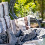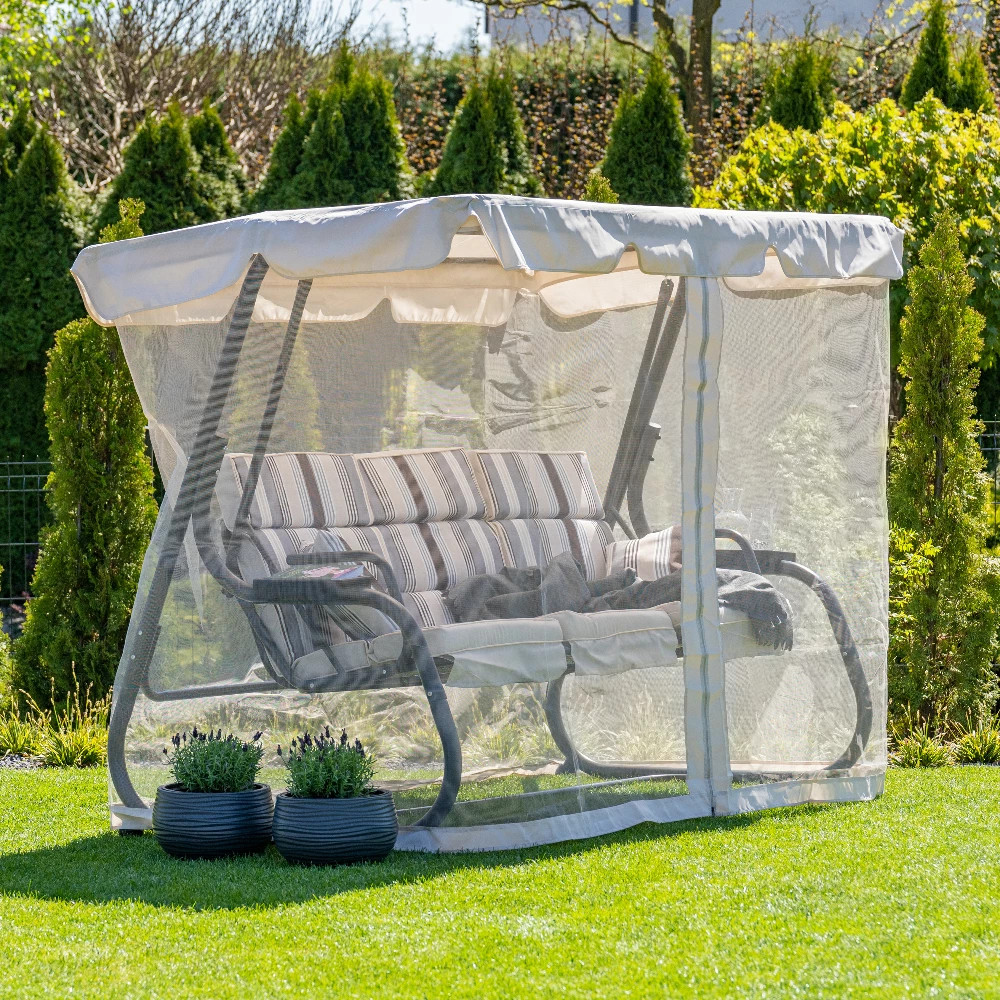 Az Ines kerti hinta beállítható dőlésszögű napvédővel rendelkezik, kényelmes párnákkal az ülésen és a háttámlán, italpolcokkal és további dekoratív párnákkal. A lehajtható funkciónak köszönhetően az Ines hinta garantálja a pihenést.