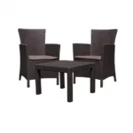 A Rosario Balcony elegáns kertibútor szett. A bemutatott készlet gyönyörű barna színű. A bútorgyártó az Allibert , amely kiváló minőségű műanyagot használ külső berendezések gyártására. A Rosario erkély szett egy dohányzóasztalból és két székből, karfákkal és üléspárnákból áll.