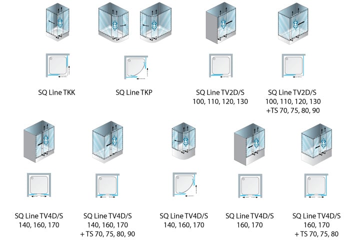 SQ Line TKK , szögletes,tolóajtós, sarokbelépős zuhanykabin. Fehér és Silver profilú változat létezik, illetve kérhető az átlátszó üvegen kívül, chinchilla, átlátszatlan biztonsági üveggel is. Kibillenthető alsó görgői segítségével, egyszerű a tisztítás. Alul, felül dupla görgőkkel ellátott termékcsalád.