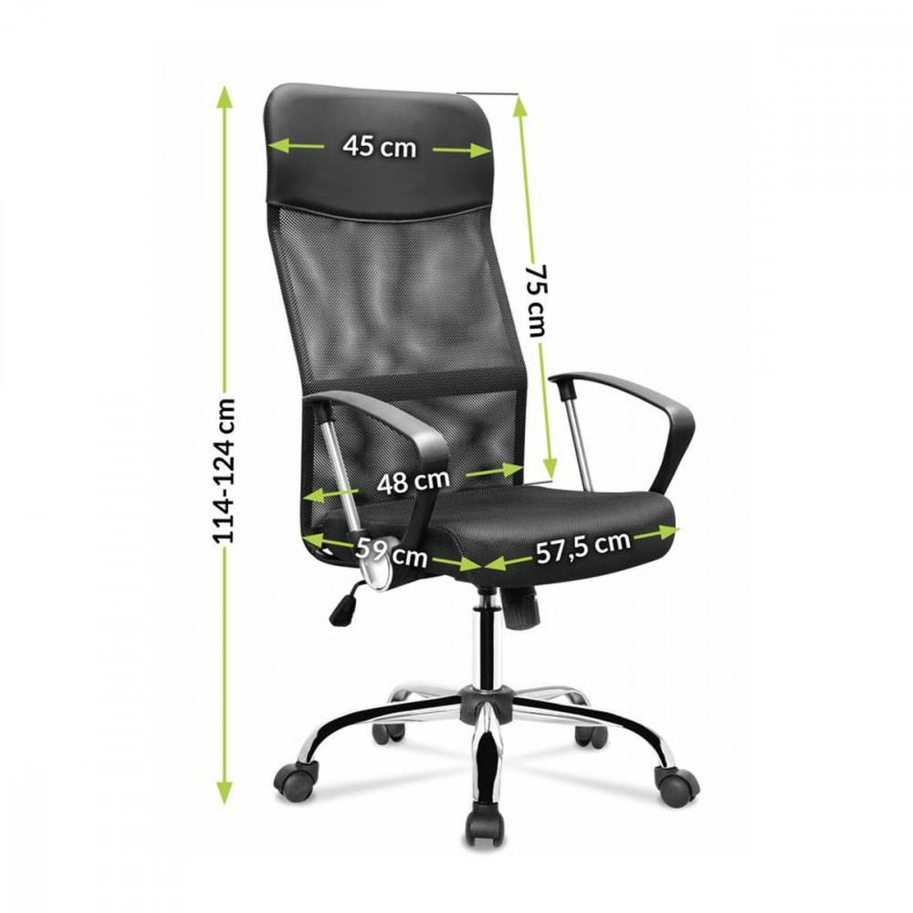 TermékjellemzőkMéret58x59x114x124 cmMax. terhelés120 kgAnyagMESH hálóAlap Átmérő32 cmSzínfekete/szürkeÜlés magasság46-56 cmForgó irodai szék mesh hálóvalA forgószék ergonómikusan kialakított háttámlával rendelkezik, amely ideális támaszt jelent a gerinc számára, és beépített magas fejtámlával, amely biztosítja a kényelmet a használat során. A beépített kartámaszok növelik a test stabilizálódását és megkönnyítik a karokat és a vállakat.A forgatható irodai szék ülése kiváló minőségű meshhálóból készül , amelynek fő előnye a légáramlás biztosítása a hát és a háttámla között. Az ülés anyaga nagyon tartós, és a szék tisztítása egyszerű. További előny a gázrugó, amely lehetővé teszi az ülés magasságának sima beállítását, a felhasználóhoz igazítva.Forgószék az íróasztalhozAz asztali szék széles talppal rendelkezik, amely biztosítja a stabilitást a használat során. A fekete forgószék nylon kerekekkel van felszerelve, amelyek megvédik a padlót a karcolódástól. Az irodai szék TILT funkcióval rendelkezik, azaz blokkolja a függőleges helyzetet és egy billenős mechanizmust.Irodai forgószék – az üzleti elegancia, a kényelem és az ergonómia kombinációjaAz ergonomikus szellőzéssel ellátott irodai szék irodába és otthonra egyaránt jó választás. A forgatható asztali szék kiváló választás mind különálló felnőtt karosszékeként, mind ifjúsági karosszékként. Az elegáns forgószék magasfokú kényelmet biztosít, miközben megtartja a felhasználó helyes testhelyzetét.Termékméreta háttámla lehetővé teszi a levegő szellőzésétaz ergonomikus alakú ülés és a fejtámla kiváló támaszt jelent a gerinc számáraa széles talp garantálja a szék stabilitásátnejlon kerekek védik a padlót a karcolódástólmodern kialakításháttámla magassága: 75 cmalsó háttámla szélessége: 48 cmfelső háttámla szélesség: 45 cm