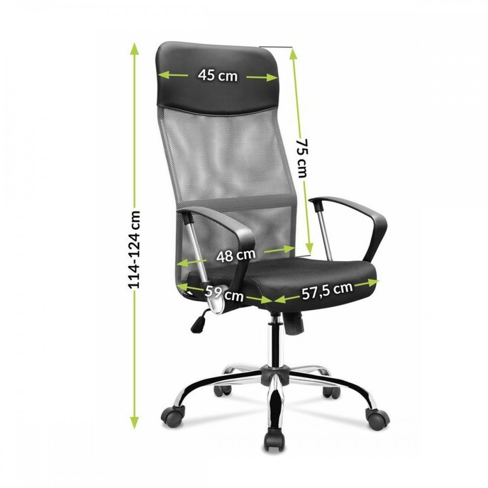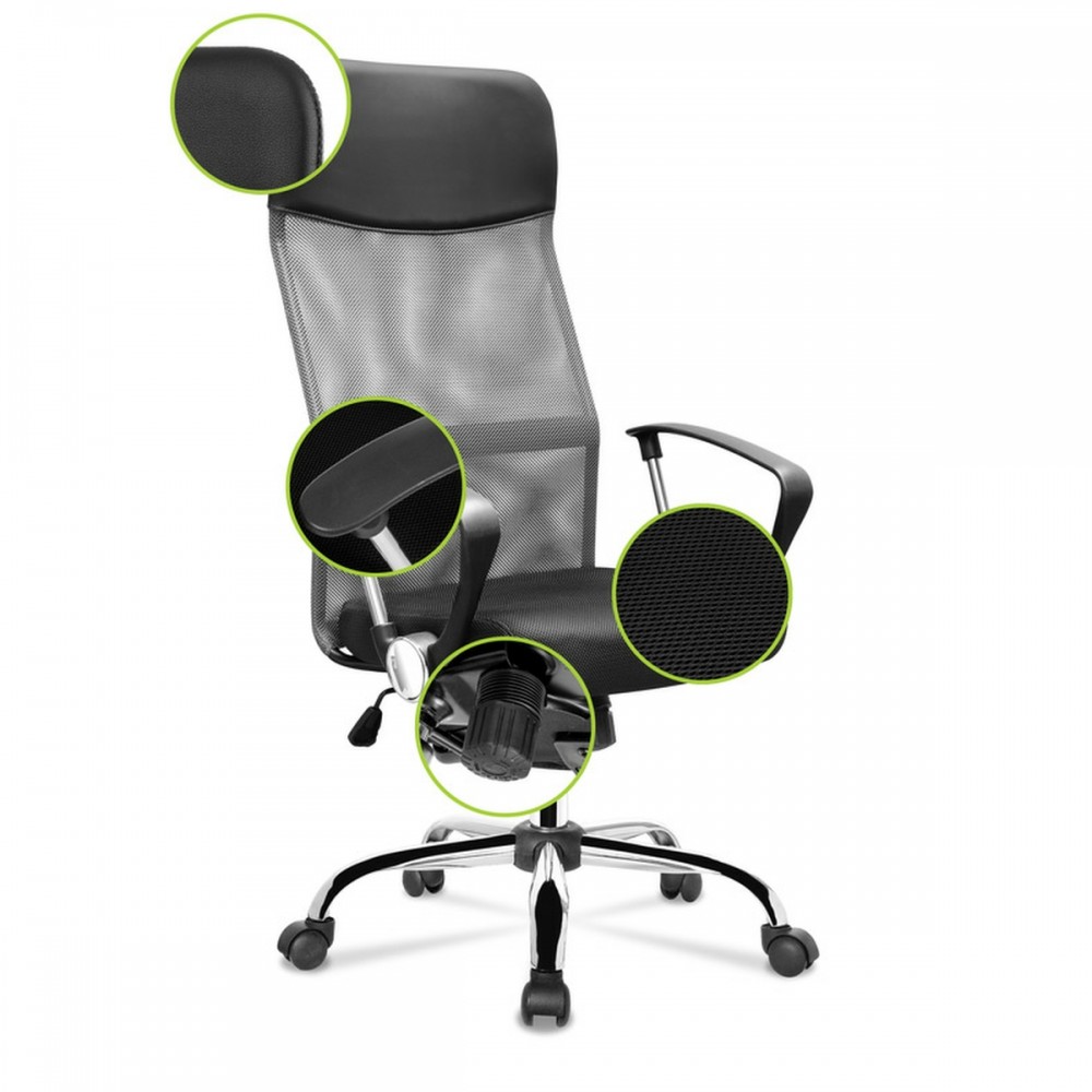 A forgószék ergonómikusan kialakított háttámlával rendelkezik, amely ideális támaszt jelent a gerinc számára, és beépített magas fejtámlával rendelkezik, amely biztosítja a kényelmet a használat során. A beépített kartámaszok növelik a test stabilizálódását és megkönnyítik a karokat és a vállakat. A forgatható irodai szék ülése kiváló minőségű mesh hálóból készül, amelynek fő előnye a légáramlás biztosítása a hát és a háttámla között. Az ülés anyaga nagyon tartós, és a szék tisztítása egyszerű. További előny a gázlift, amely lehetővé teszi az ülés magasságának beállítását, a felhasználóhoz igazítva.