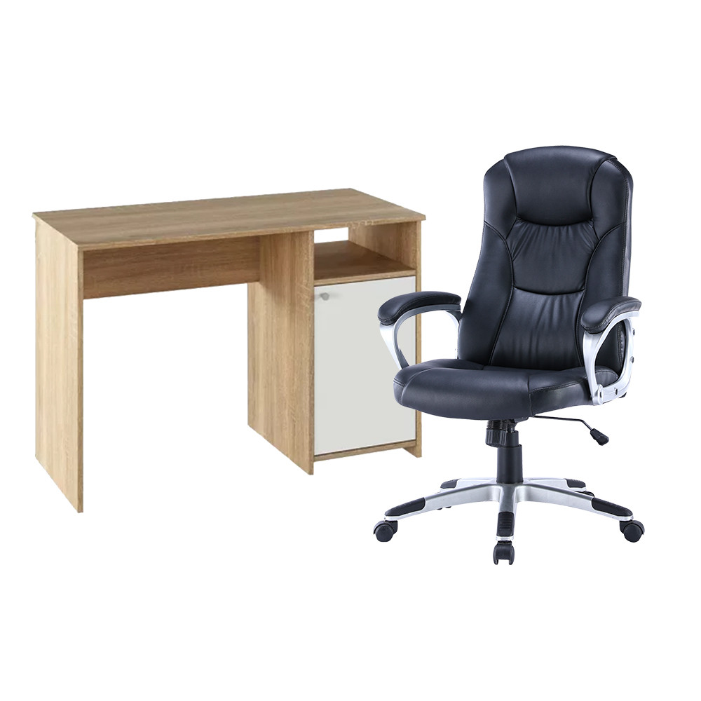 Lygon sonoma tölgy-fehér számítógépasztal Diamond forgószékkelLygon sonoma tölgy-fehér számítógépasztal és a kényelmes Diamond forgószék ötvözi hatékonyságot és a stílust tökéletesen otthoni vagy irodai munkakörnyezetben!Számítógépasztal LT5872, sonoma tölgy-fehérIsmerd meg a Számítógépasztal LT5872 sonoma tölgy-fehér kivitelben, amely praktikummal és stílussal ötvözi az otthoni vagy irodai munkakörnyezetet!Ez a kiváló minőségű számítógépasztal laminált DTD anyagból készült, ami rendkívül tartós és ellenálló. A fehér és a sonoma tölgy színek tökéletes harmóniája eleganciát és frissességet kölcsönöz az enteriőrnek. Az asztal méretei (SzéxMéxMa) 110×74,5×50 cm, így optimális méretet nyújt a hatékony munkavégzéshez anélkül, hogy túl sok helyet foglalna el a helyiségben.A számítógépasztal kialakítása számos tárolási lehetőséget kínál. A nyitott tárhely méretei (SzxMé) 35×45,8 cm, így könnyedén elhelyezheted benne a gyakran használt eszközöket vagy dokumentumokat. Emellett a szekrények méretei (34,6×45,8×50 cm) rejtett tárolási lehetőséget biztosítanak a nagyobb tárgyak vagy érzékeny munkaeszközök számára. A jobboldali ajtó mögött egy további polc és egy praktikus nyitott tárhely található, amelyek segítségével mindig kéznél lesznek a szükséges kellékek.A szék számára kialakított tér szélessége (69,2 cm) ideális, hogy könnyedén megközelíthesd a számítógépasztalt. Az anyagvastagsága 16 mm, ami stabilitást és megbízhatóságot biztosít a mindennapi használat során.A Számítógépasztal LT5872 sonoma tölgy-fehér kivitelében teherbírása 25 kg, így nyugodtan elhelyezhetsz rajta a számítógépet, nyomtatót és más munkaeszközöket. A polc teherbírása 5 kg.Legyen szó otthoni irodáról vagy munkahelyről, a Számítógépasztal LT5872 sonoma tölgy-fehér kivitelben megfelel a legmagasabb igényeknek. Tervezett kialakítása és praktikus tárolási lehetőségei segítenek rendet és hatékonyságot teremteni a munkakörnyezetedben.Diamond irodai forgószékTermékjellemzőkForgószék bevonatPU,PVCKartámaszporszórtGázlift2-es osztályÜléslemezpillangósTermékleírásÜdvözöllek az irodai berendezések világában, ahol bemutatom neked a kivételes Diamond irodai forgószéket! Ez a szék kifejezetten a kényelem, stílus és funkcionalitás iránt elkötelezett személyeknek készült, akik számára fontos, hogy munkakörnyezetük ne csak hatékony, de esztétikailag is vonzó legyen. A Diamond forgószék méretei 46x72x118-128cm, amelyek lehetővé teszik a testreszabott beállítást és az optimális kényelmet. A szék fém vázzal rendelkezik, ami kiemelkedő stabilitást és tartósságot biztosít. A szilárd szerkezet lehetővé teszi a szék hosszú élettartamát és a mindennapi használatot anélkül, hogy elvesztené az eredeti formáját és minőségét.A Diamond szék magas háttámlával büszkélkedhet, ami különösen hasznos azoknak, akik hosszú órákon át ülnek az asztaluknál. A magas háttámla kényelmes támaszt biztosít a hát alsó és felső részének, így segít megelőzni a hát- és nyakfájdalmakat, amelyek gyakran jelentkezhetnek a hosszú ülés során. Emellett az ergonomikus kialakítás támogatja a megfelelő testtartást, amely hozzájárul a hatékony és koncentrált munkavégzéshez. A Diamond forgószék kiváló minőségű párnázattal rendelkezik, amelyet a legjobb minőségű anyagokból készítettek, és kényelmes ülést biztosítanak. A szék ülése is magasan állítható, így könnyen beállíthatod az optimális magasságot a kényelmes és ergonomikus munkapozíció érdekében. A szék elforgatható talppal van ellátva, ami lehetővé teszi a szabad és könnyű mozgatást az irodában vagy az asztal körül, anélkül, hogy fel kellene állnod a helyedről. A kerekek csendesek és kímélik a padlót, így zavartalanul folytathatod a munkát anélkül, hogy a szék hangosan suhanna a padlón. A Diamond irodai forgószék stílusos és modern kialakítása miatt kitűnő választás bármely irodai környezetbe. A gazdag színpaletta lehetővé teszi, hogy megtaláld a saját stílusodhoz illő színt, amely harmóniában van a többi irodai berendezéssel és dekorációval.Összefoglalva, a Diamond irodai forgószék olyan kiváló minőségű berendezés, amely kényelmet, funkcionalitást és stílust nyújt. A fém váza biztosítja a stabilitást, a magas háttámla támogatja a megfelelő testtartást, és a modern design tökéletesen illeszkedik bármely irodai térbe. Bízhatod magadat ennek a kiváló forgószéknek a kényelmére és megbízhatóságára, miközben hatékonyan és stílusosan végzed a munkádat.Diamond irodai forgószékTermékméret