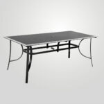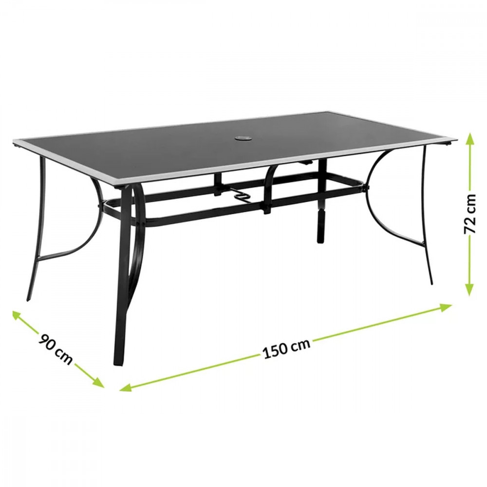 A kerti asztal szerkezete alumíniumból készült. A teteje 5 mm-es edzett üvegből készül , amely ellenáll a kisebb karcolásoknak. A felhasznált anyagok biztosítják az időjárási viszonyokkal szembeni ellenállást. A modern kerti asztalt 6 fő számára tervezték , amely lehetővé teszi a bútorok használatát szeretteivel való találkozók során. Az egészet megfelelő magasságban tervezték, hogy kényelmesen étkezhessen. Előnye a napernyő beépített furata , így az ernyő használata lehetővé teszi az összes felhasználó egyenletes árnyékolását.