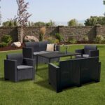 Ez egy Olaszországban gyártott grafit színű, kényelmes és elegáns bútor szett hat 57,5x 75x 79 cm-es fotelt és egy 74x 90x 150 cm-es négyszögletes asztalt foglal magába. Ez a 6 személyes kerti bútor garnitúra elegendő helyet biztosít az egész család számára, hogy mintha a nappaliban ülnének, mégis a szabad levegőn tudják tölteni az időt. Nagyszerű választás akkor is, ha napközben szeretsz az udvaron pihenni és olvasgatni, elterüülve egy kanapén. Alkalmas családi összejövetelekhez, üzleti rendezvényekhez, hisz minden teret moderné és hangulatossá változtat megjelenésével.