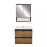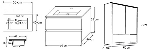 A fürdőszoba bútor kevés helyet foglal viszont rendelkezik két tágas fiókkal és egy felső bútorral is, ahol kényelmesen elférnek a fürdőszobai pipere eszközök. Kevés helyigénye miatt kisebb fürdőszobák berendezésére is alkalmas, például panel lakásokban.