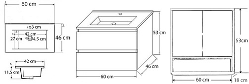 A fürdőszoba bútor kevés helyet foglal viszont rendelkezik két tágas fiókkal és egy felső bútorral is, ahol kényelmesen elférnek a fürdőszobai pipere eszközök. Kevés helyigénye miatt kisebb fürdőszobák berendezésére is alkalmas, például panel lakásokban.