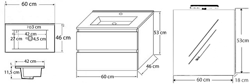 Az alsó bútorhoz emellett tartozik egy 60-as tükör is. A termék magas minőségű bútorlapból készül és színben passzoló élzárókkal van ellátva. A fürdőszoba bútor felfüggesztett kivitelben kapható.