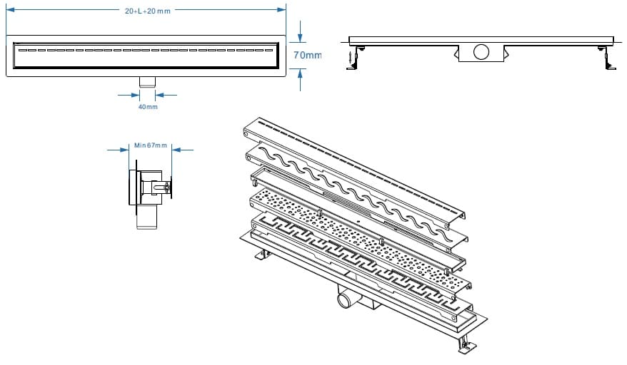 rozsdamentes acél folyóka test rögzítőkkel, üveg betét, nedves bűzzár, 50/40 PVC szűkítő, fém kapocs a rács kiemeléséhez, szigetelő anyag (szalag), használati útmutató