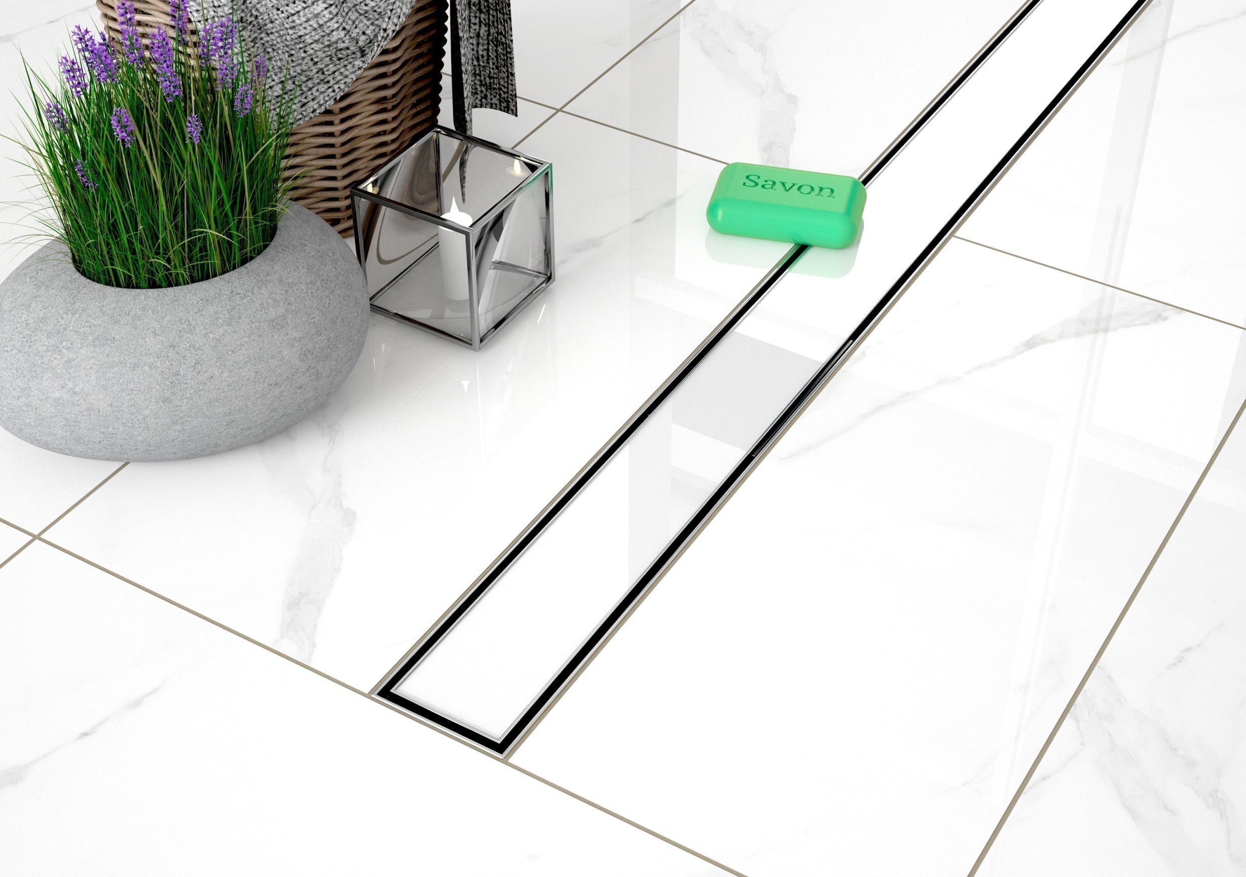 rozsdamentes acél folyóka test rögzítőkkel, üveg betét, nedves bűzzár, 50/40 PVC szűkítő, fém kapocs a rács kiemeléséhez, szigetelő anyag (szalag), használati útmutató