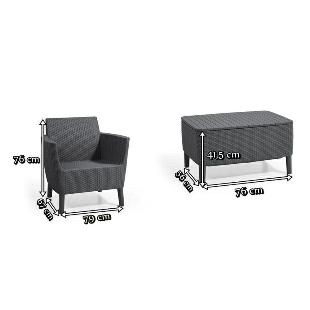 A Curver Salemo kerti bútor négy személy számára nyújt helyet a friss levegőn való pihenéshez, és a lehető legnagyobb kényelmet nyújtja. A kényelmet a puha háttámla alakjának , puha üléspárnák és a széles karfák biztosítják. A dohányzóasztal, amely a készlet szerves része, alapvető funkciójában nagyon jól működik, de tárolóhelyként is használható. Használható tárgyak tárolására, melyeket kéznél szeretnénk tartani, miközben a kertben pihenünk.