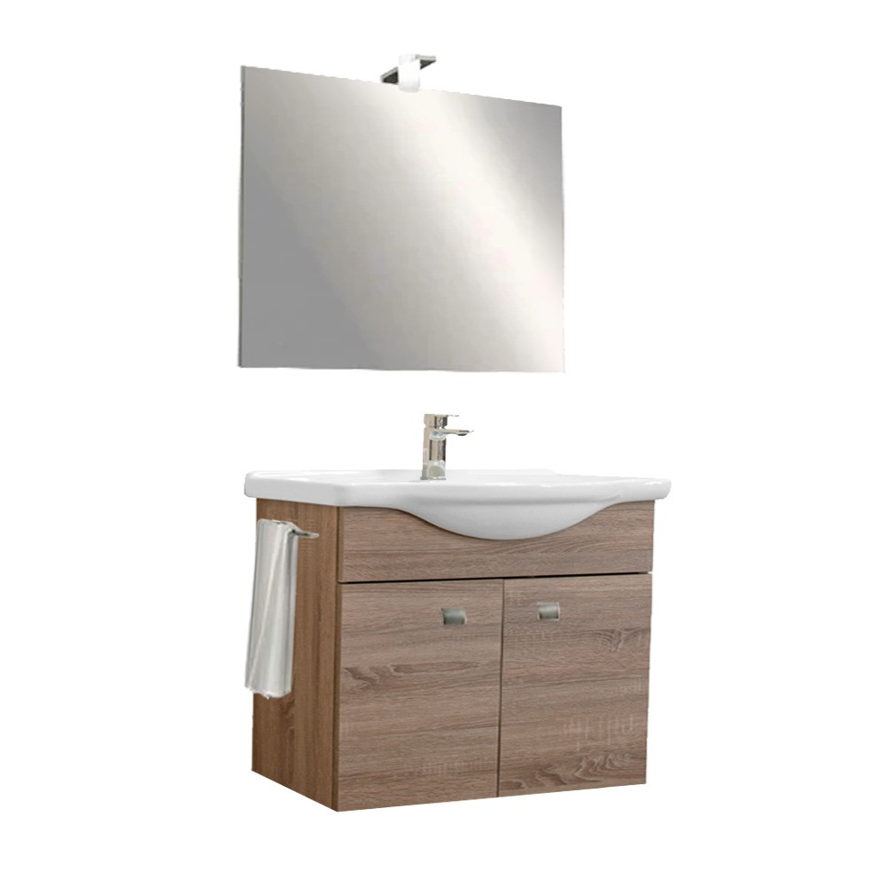 TermékleírásA Zeus 85 komplett fürdőszobabútor egyedivé varázsolja az Ön fürdőjét is! A fürdőszoba bútor kevés helyet foglal viszont tágas szekrénnyel rendelkezik ahol kényelmesen elférnek a fürdőszobai pipere eszközök. Kevés helyigénye miatt kisebb fürdőszobák berendezésére is alkalmas, például panel lakásokban. A termék magas minőségű bútorlapból készül és színben passzoló élzárókkal van ellátva. A fürdőszoba bútor felfüggesztett kivitelben kapható.A terméket összeszerelve szállítjuk így nem kell aggódnia az összeszerelés miatt sem. A csomag részét képzi egy méretben passzoló kerámia mosdó is, így ezt nemkell külön beszereznie. A mosdó elkészítésekor kiváló minőségű kerámiátalkalmaztak, ezzel garantálva az időtállóságot. A mosdóban egy csaptelepnek van kialakított hely. A csomagnak nem része a világítás. Termékjellemzők :Szürke Sonoma tölgyTükörrelKerámia mosdóvalFelfüggesztett kivitelKiváló minőségű bútorlapból készül A funkcionalitás mellett természetesen a bútor megjelenésére is nagy figyelmet fordítottak. Szürke Sonoma tölgy színének és letisztult modern vonalainak köszönhetően harmóniát teremt az összes fürdőszoba hangulatában. Az ajánlat csaptelepet nem tartalmaz.